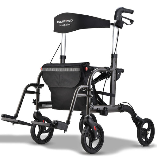 2-In-1 Foldable Aluminium Walking Frame Rollator And Transit Wheelchair With Bag Titanium Colour