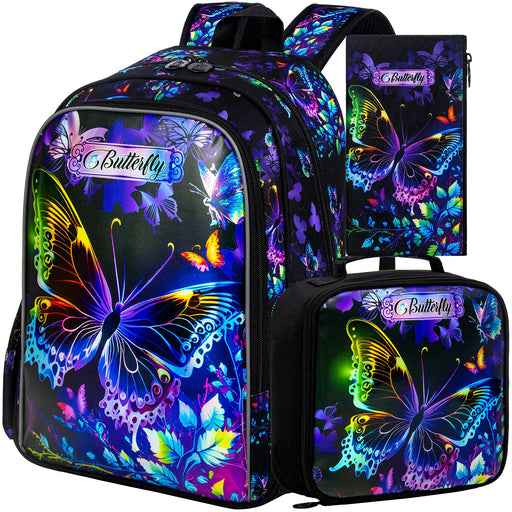 3 Piece 16 Inch Girls Butterfly Backpack Set With Lunch Box For School Preschool Kindergarten