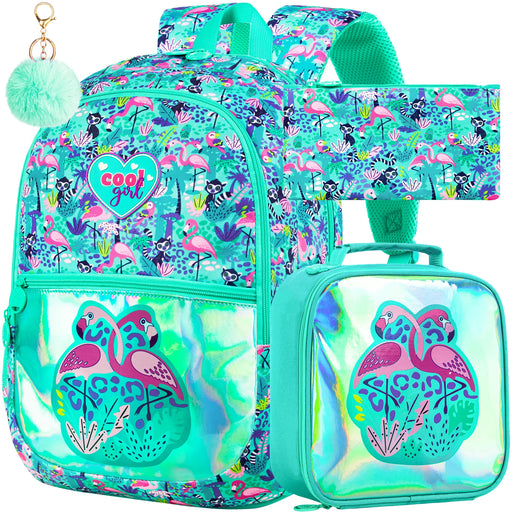 3 Piece Flamingo Backpack Set For Girls 16.5 Inch Bookbag With Lunch Box Waterproof Lightweight Kindergarten Ready