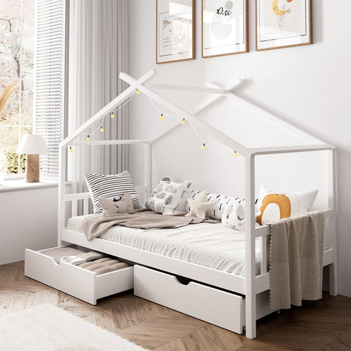 Bed Frame Wooden Single Size Timber House Frame Storage Drawers White