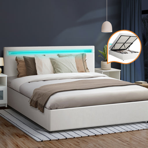 Bed Frame Queen Size Rgb Led Gas Lift Storage Base White
