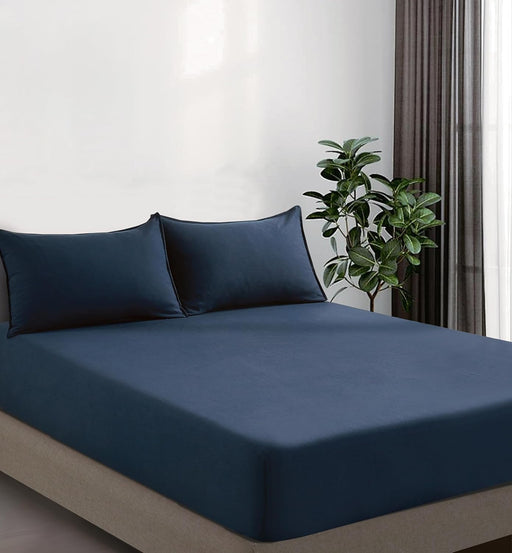 Double Size 100% Vintage Washed Microfibre Fitted Sheet Set – Ultra Soft & Lightweight All-Season Fitted Sheet With 2 Pillowcases - Navy Blue