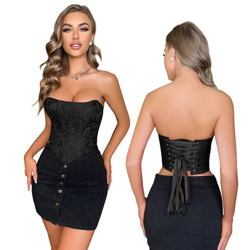 Strapless Lace Up Boned Bustier Corset Plus Size Xs-6Xl Black Brocade Side Zip Bodyshaper Crop Top