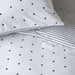 • The duvet cover is reversible: it has a heart print on the front and a black-and-white striped print on the back.