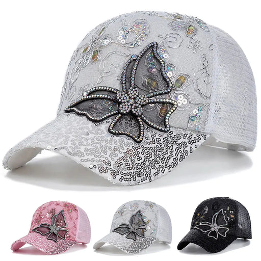 Glitter Butterfly Lace Baseball Cap Adjustable Sun Hat For Spring / Summer