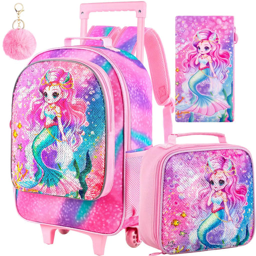 3 Piece Mermaid Rolling Backpack For Girls Water Resistant Uv Printed Fits Kids School Travel