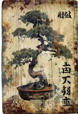 Retro Bonsai Tree Tin Sign Japanese Font Aged Wood Look