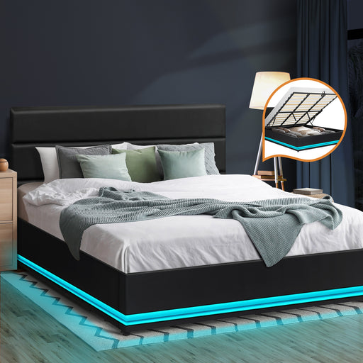 Rgb Led Bed Frame Queen Size Gas Lift Base With Storage Black Leather