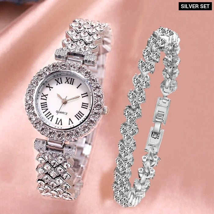 2 Piece Rhinestone Dial Watch Set Stainless Steel Band