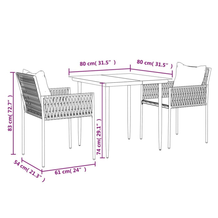 3 Piece Garden Dining Set with Cushions Poly Rattan and Steel Tonibpo