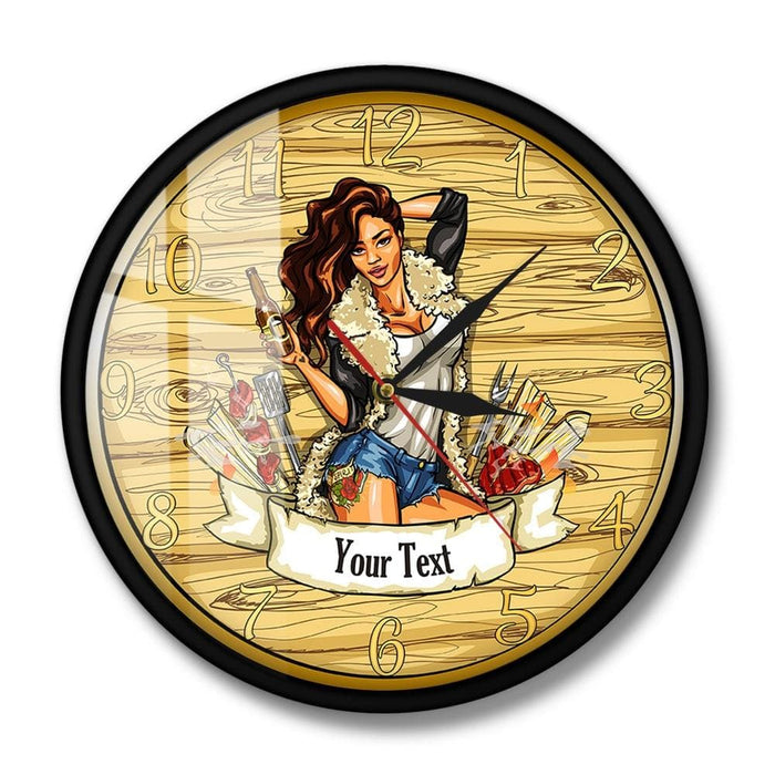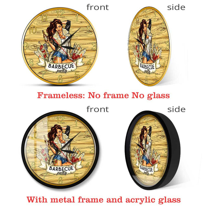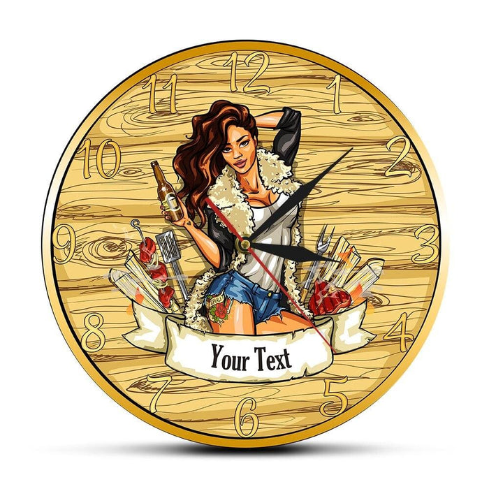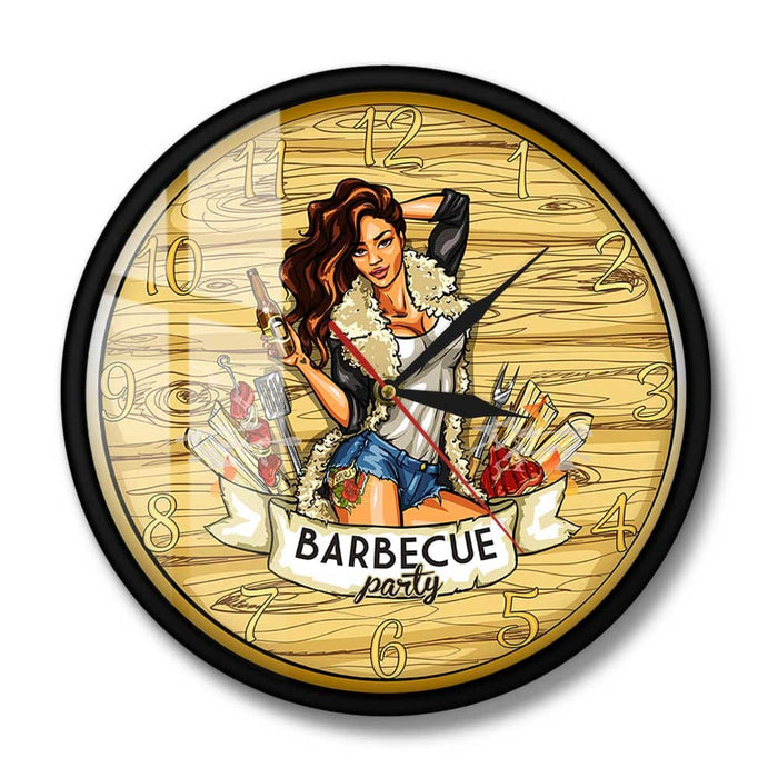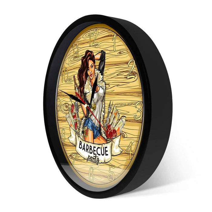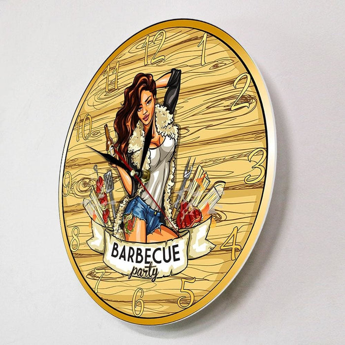 Barbecue Party Wall Sign Modern Wall Clock Cow Girl Holding Beer Grill Bbq Grill